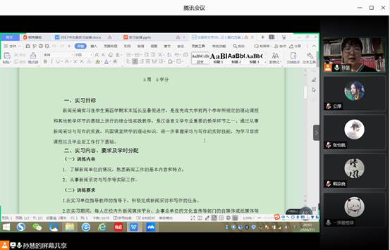 汉语言文学专业2017级新闻实习工作的顺利开展,2020年7月1日晚8点,汉语言文学专业2017级新闻实习动员会顺利举行,此次实习动员会由中文系主任孙慧老师主持,采用腾讯会议在线交流的方式,汉语言文学专业2017级全体本科生参与了此次会议。