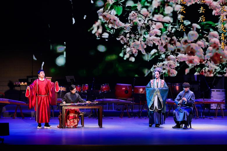 汉乐团与附属中学“青春飞扬”合唱团的中学生们共同演绎的《小雅·鹿鸣》,各声部间宛如天籁之音交织,既独立成章又和谐共生,构建出一幅层次分明、色彩斑斓的音乐画卷。雄浑磅礴、气势恢宏的原创作品《大汉气象》,蕴含着汉代作为大一统封建制国家所独有的文化自信与鲜明特色。古琴之音的婉转脱俗,加上一笔一划的千钧之力,一曲《梅花三弄》以古琴独奏融合书法艺术,共同织就的一幅清雅超凡、意境深远的画卷。《蹀马倾杯舞千秋》以古筝重奏的华丽旋律和欢快节奏,将观众带入了繁华绚烂的盛唐景象。《扬州慢》运用古琴、箫与重唱的形式深情演绎,抒发了醇厚真挚的故国情怀。《十面埋伏》以其细腻笔触和磅礴气势,生动逼真地描绘出楚汉相争那波澜壮阔的画面。一首《红旗颂》以激昂的旋律、丰富的情感和浓郁的民族特色,展现了中国人民对祖国的热爱和对革命胜利的自豪之情,让观众感受到了爱国奋进的精神力量。附属小学“小荷”合唱团带来的《让我们荡起双桨》,以悠扬舒畅的旋律,体现了儿童的活泼和朝气,带领观众重温儿时的欢乐时光。《花好月圆》充分利用了民族管弦乐队的丰富音色,通过不同乐器的组合和演奏技法的变化,让观众在节奏明快、旋律流畅的欢乐氛围中,提前感受新春佳节的幸福与喜悦。最后,音乐会在由校汉乐团、教职工合唱团、大学生合唱团、附属中小学合唱团师生们共同演唱的《我的祖国》中落下帷幕。全体观众齐声同唱,将音乐会气氛推向高潮。